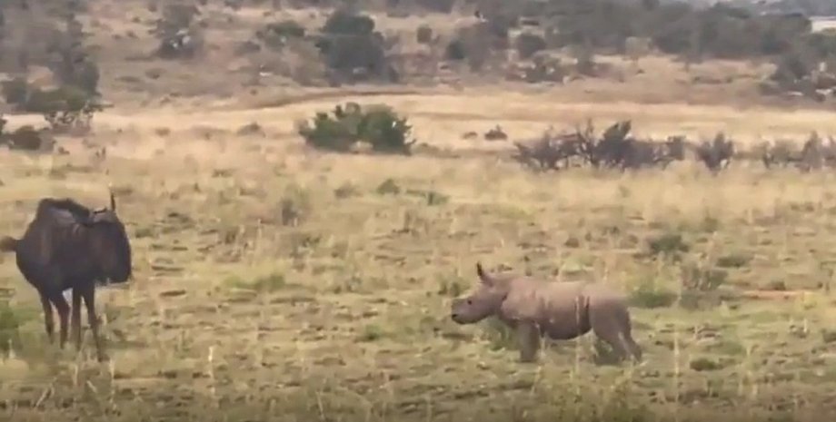 “Детеныш носорога игриво бросается на антилопу гну, прежде чем убежать обратно к маме”, — подписано видео в соцсетях.