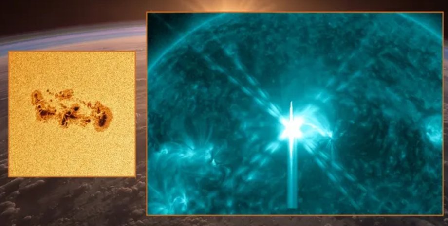 Слева: солнечное пятно AR 4366, которое в 15 раз больше Земли. Справа: мощная вспышка на Солнце класса Х4.2 | space.com